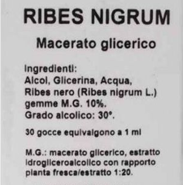 Ribes nigrum gliceric macerate 2- 10 %: oral drops, alimentary integrator Ribes nigrum L. extract, fresh gems in glycerin, alcohol and water.