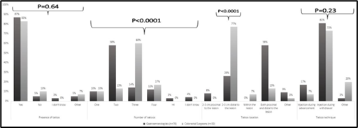 The majority of physicians (86.1%) use endoscopic tattooing to mark suspected colorectal cancers for operative localization (Gastroenterology, 87.2%; colorectal surgery, 83.3%). There was a statistically significant difference between gastroenterologists and colorectal surgeons for tattoo location (p<0 OR =9.5, CI =3.55-25.56)>