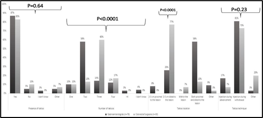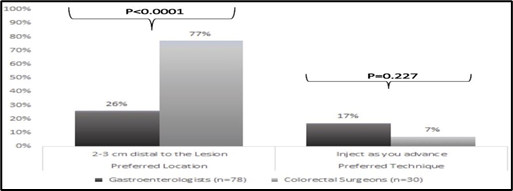 Fig 2. Comparison of Gastroenterologists and Colorectal Surgeons Regarding Endoscopic Tattooing Practices