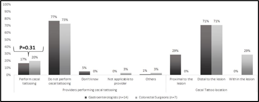 Fig 3. Comparison of Gastroenterologists and Colorectal Surgeons Regarding Endoscopic Cecal Tattooing Practices.