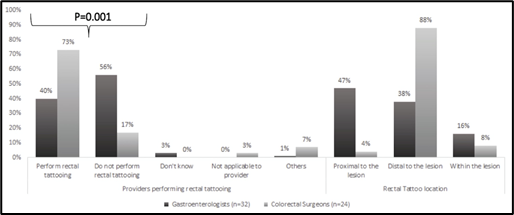 Fig 4. Comparison of Gastroenterologists and Colorectal Surgeons Regarding Endoscopic Rectal Tattooing Practices